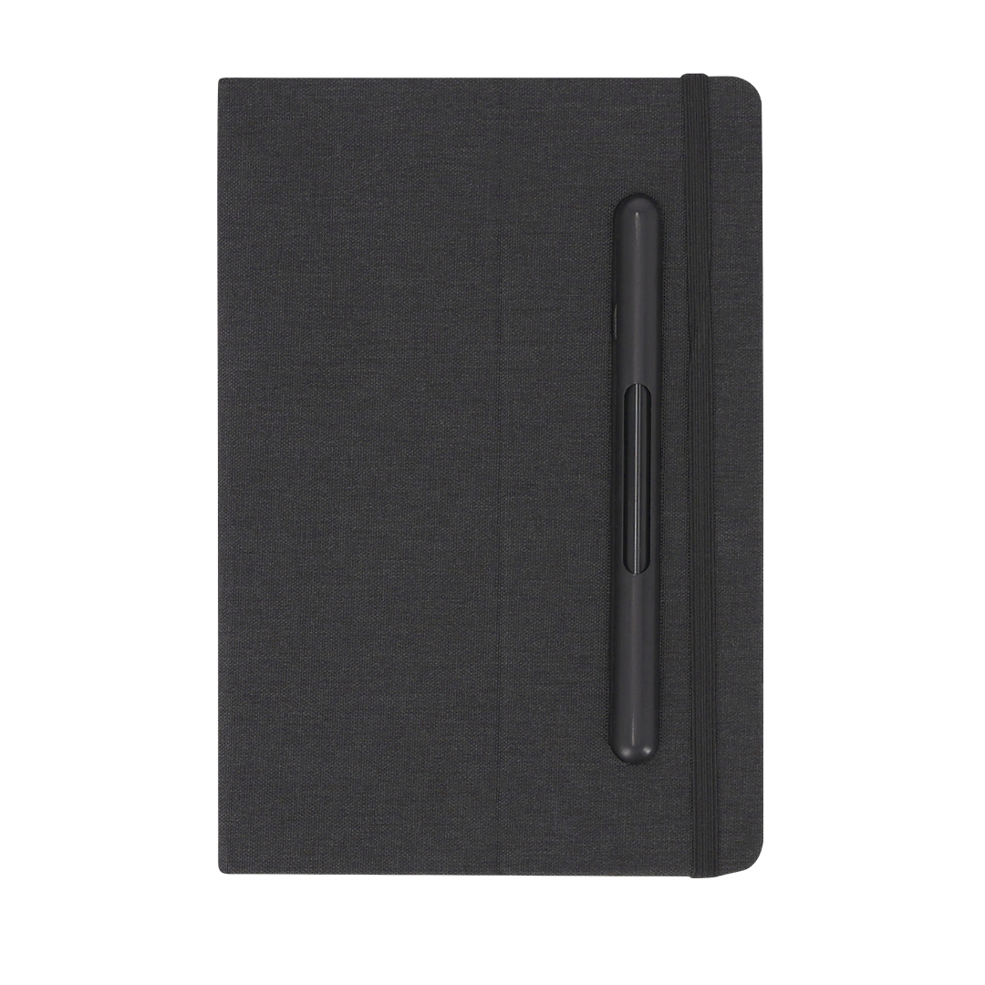 Bloc de notas soporte con tapas rígidas fabricado en RPET 600D. Versátil soporte integrado en la portada. Incluye bolígrafo lápiz eterno. Contiene 96 hojas interiores a disposición de una raya. Cuenta con elástico de cierre. Con logotipo RPET.