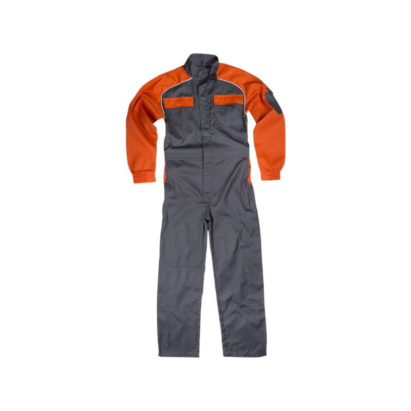 Buzo combinado con vivos a contraste. Cuello alto y cierre de cremallera de nylon de doble tirador oculta por solapa postiza. Velcro en cuello y solapa. Manga ranglán combinada, con vivos y un bolsillo auxiliar con cierre de velcro. Puño con elástico. Dos bolsos de pecho de plastón con cartera de velcro, dos bolsos de abertura inclinada en los costados. Dos bolsos traseros de plastón con cartera de velcro. Carteras y vistas combinadas. Rodilleras reforzadas. Cinturilla con elástico en la espalda.
