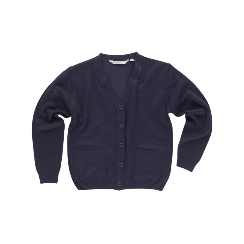 Chaqueta de escote a pico en punto fino. Cierre central de cinco botones al tono. Dos bolsos de plastón. Puños y cintura elásticos en punto canalé.