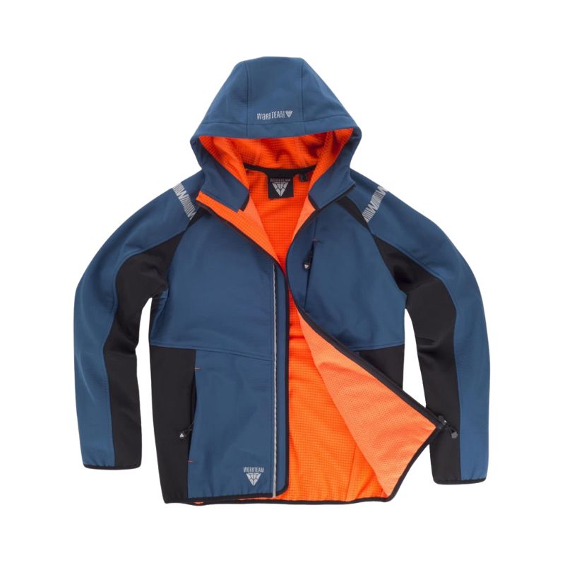 Workshell de tejido reciclado. Combinada y con detalles reflectantes. Manga ranglan. Cuello alto y cubrecosturas interior. Capucha con cordón elástico y pieza ajustable. Cierre de cremallera de nylon. Solapa protectora interior vuelta en la parte superior cubriendo la cremallera. Un bolso de pecho y dos laterales interiores con cierre de cremallera de nylon. Puños y bajo ribeteados con bies elástico. Cortes decorativos y cremalleras de cierre invertido. Cinta reflectante decorativa personalizada en los hombros. Tejido reciclado corta vientos, repelente al agua y resistente al desgarro con membrana interior transpirable y aislante e interior de alta capacidad térmica. Interior polar con patrón de cuadrícula. Forro de rejilla en delantero.