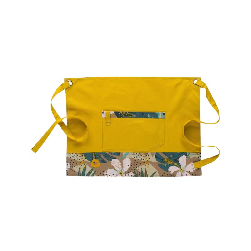 Delantal francés en tejido canvas estampado combinado. Un gran bolso central de plastón combinado y compartimentado, con trabilla. Cintas para ajustar en la cintura. Diseño contemporáneo con remaches de cobre.
