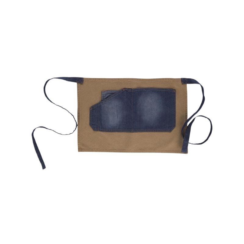 Delantal francés corto en tejido canvas combinado con vaquero. Un bolso central de corte asimétrico compartimentado con bolsillo relojero interior. Cintas de tejido vaquero para ajustar en la cintura. Diseño contemporáneo con desgastado y remaches de cobre.