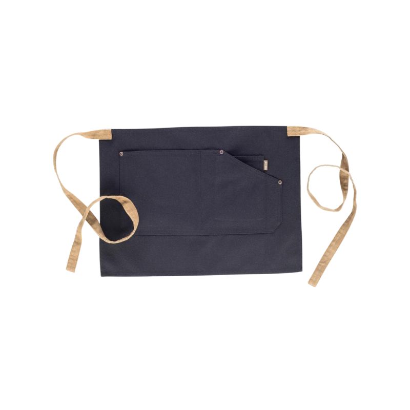 Delantal francés corto en tejido canvas. Un bolso central de corte asimétrico compartimentado con bolsillo relojero interior. Cintas para ajustar en la cintura. Diseño contemporáneo con remaches de cobre.