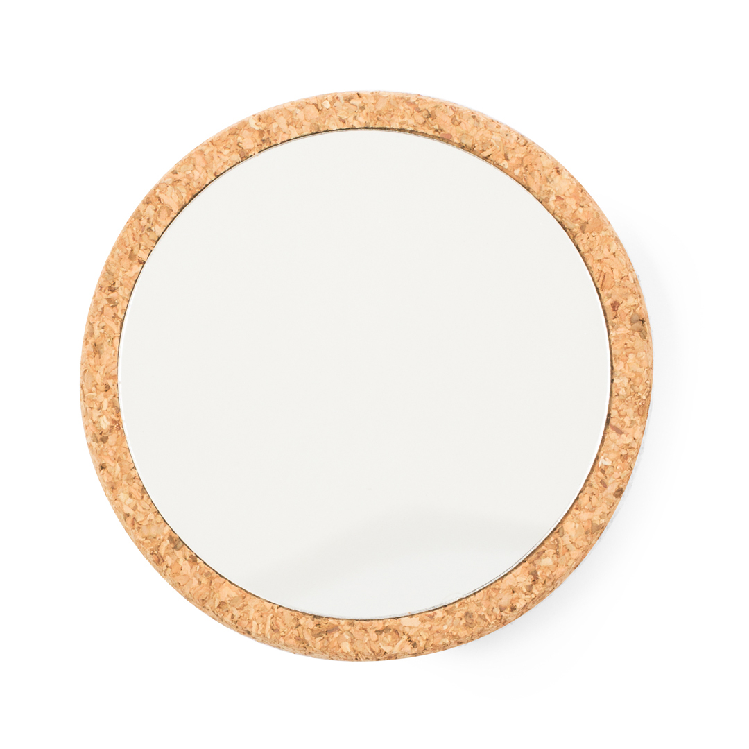 Espejo 1X fabricado en corcho. Práctico espejo portátil recubierto de suave corcho y presentado en una caja individual diseño kraft.