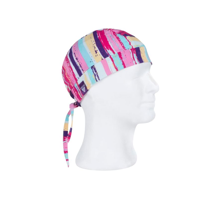 Bandana de tejido elástico y estampado. Ajuste con elástico combinado y cordones en la nuca.