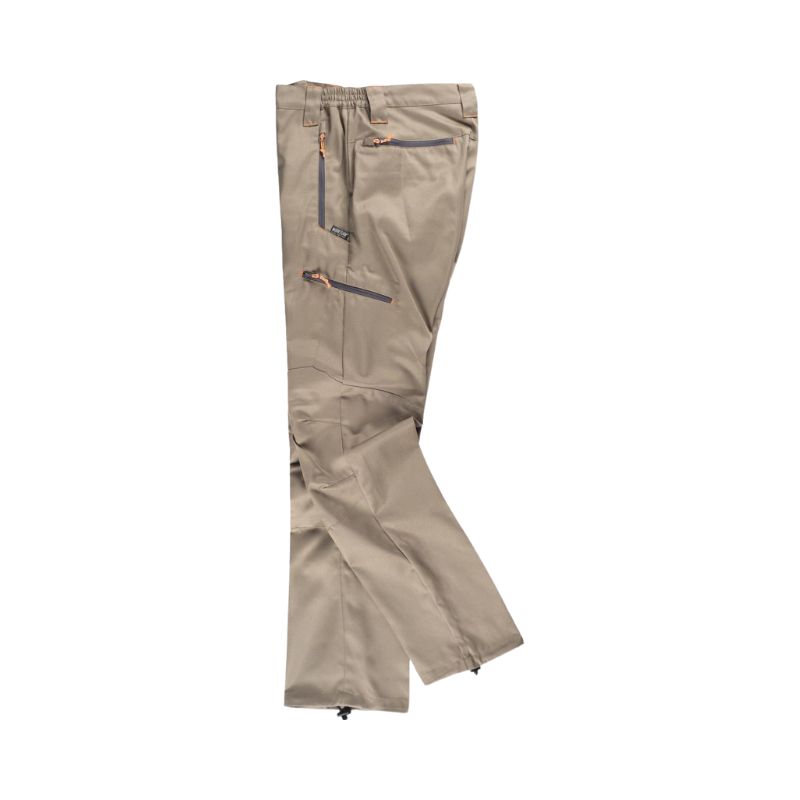 Pantalón en mezcla de viscosa con refuerzos. Dos bolsos de abertura vertical en los costados, dos bolsos laterales y dos bolsos traseros, todos interiores con cremallera de cierre invertido. Rodilleras reforzadas. Bajos con cordón elástico y pieza ajustable. Cortes decorativos y presillas a contraste. Elástico en los laterales de la cintura. Trabillas anchas. Cierre de corchete y bragueta de cremallera. Tejido resistente que permite la transpiración.