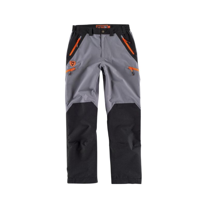 Pantalón impermeable combinado. Dos bolsos de abertura inclinada en los costados y dos bolsos laterales, todos interiores con cremallera de cierre invertido. Pinzas en rodillas. Bajos ajustables con velcro. Elástico en los laterales de la cintura y cubrecosturas interior. Trabillas. Cierre de corchete metálico y bragueta de cremallera. Forrado.
