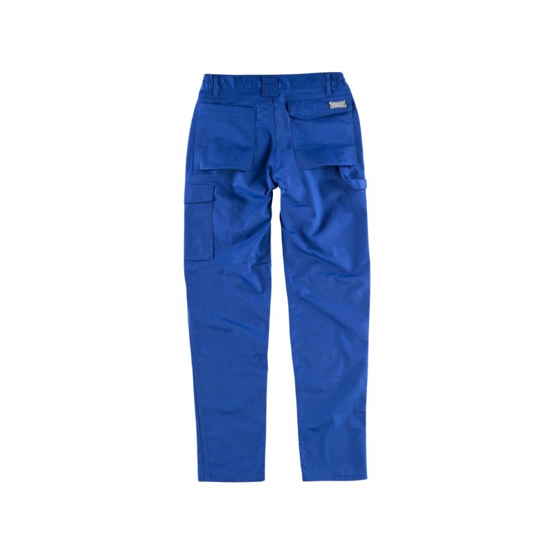 Pantalón de tejido elástico bidireccional por construcción. Dos bolsos de abertura inclinada en los costados y un bolso lateral con pliegue inferior y cartera de velcro. Dos bolsos traseros con pliegue inferior, uno con cartera de velcro y un bolso de espátula. Trabilla porta martillo. Presillas a contraste. Elástico en los laterales de la cintura. Trabillas de diferente tamaño. Cierre de botón metálico y bragueta de cremallera.