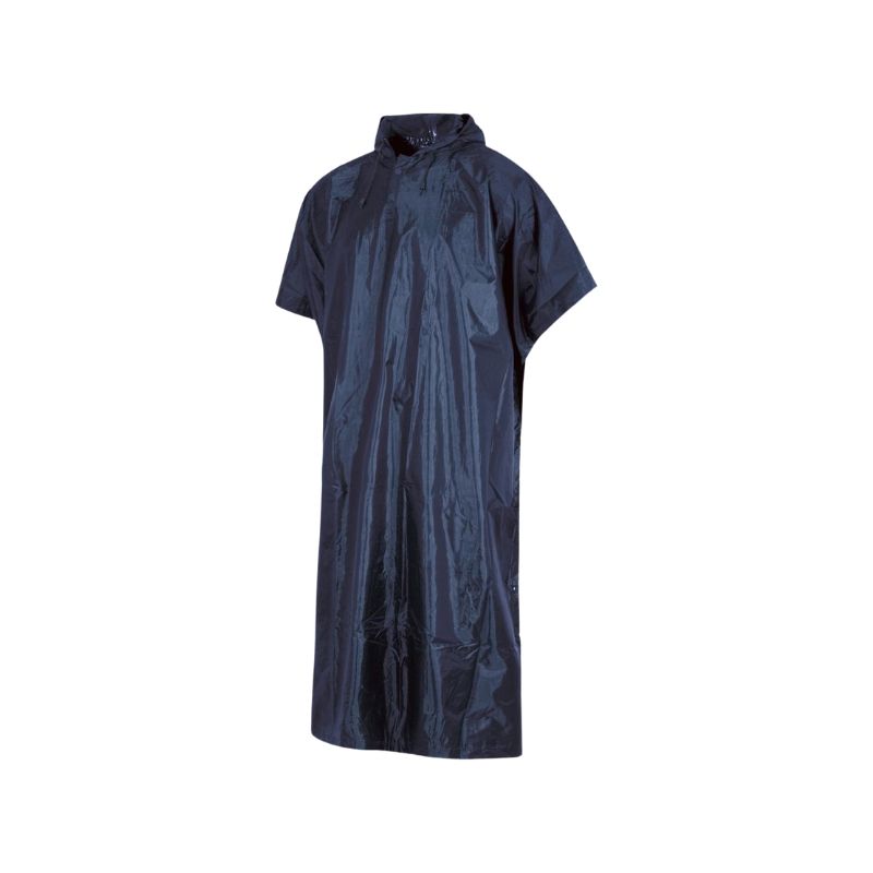 Poncho impermeable de cuerpo entero. Capucha ajustable con cordón. Cuello con tapeta de dos corchetes. Aberturas laterales con cierre de corchetes.