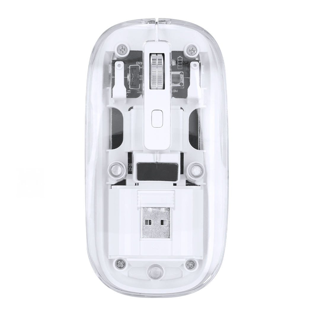 Ratón óptico inalámbrico de original diseño, con cuerpo transparente que permite ver los componentes internos del dispositivo. Con batería integrada de 300 mAh y con puerto de carga Tipo C (cable incluido). Incluye botón DPI, con conexión ?plug and play? por USB y viene presentado en caja individual de diseño kraft.