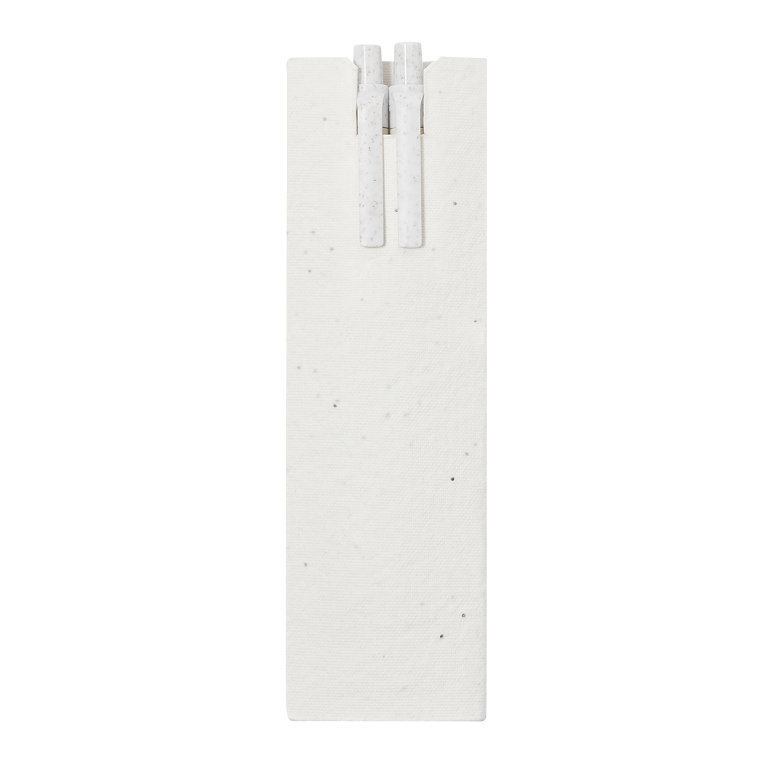 Set de bolígrafo y lápiz eterno fabricados con cartones de leche reciclados, presentados en funda de papel con semillas. Bolígrafo de tinta azul y lápiz con punta eterna, para así usar siempre el mismo lápiz y no generar residuos, ambos con mecanismo pulsador y clip a juego fabricados en Caña de Trigo, con distintivo grabado. Con distintivo de cartón de leche reciclado en el cuerpo. La funda incluye semillas de petunia, convirtiéndolo en papel plantable al final de su vida útil. Incluye instrucciones de plantado en la cubierta trasera.Los Cartones de Ceche se componen en su mayor parte de cartón y aluminio. Durante su proceso de reciclado, se separan los distintos materiales del envase para su reutilización y nuevo uso, contribuyendo así a recorrer el camino infinito de la economía circular. Este material se caracteriza por su alto grado de reciclabilidad, así como por su ligereza y resistencia.La Caña de Trigo fomenta la utilización de materias primas naturales, reduciendo así las emisiones contaminantes.
