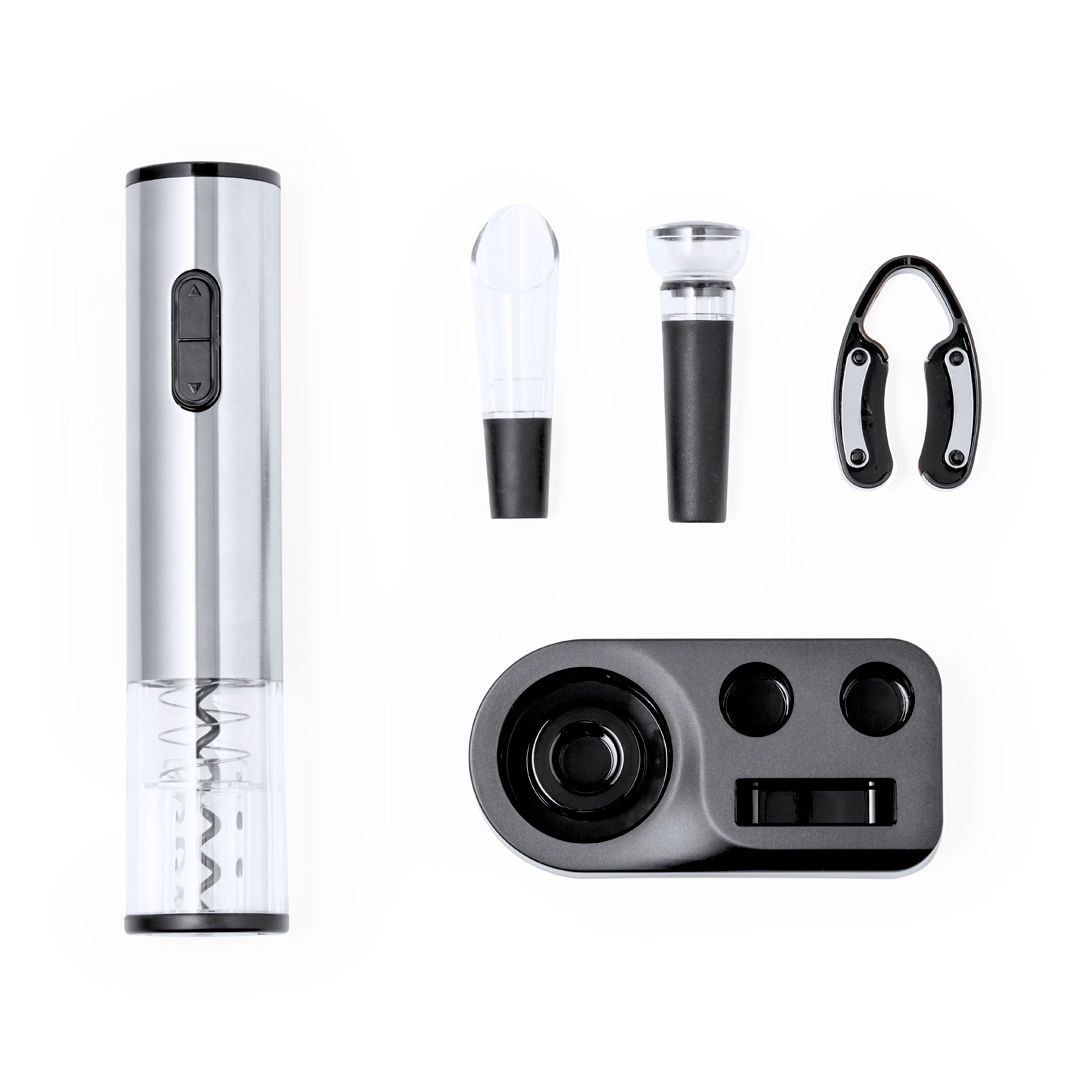 Práctico set de vinos con 4 accesorios. Contiene un sacacorchos eléctrico alimentado por 4 pilas AAA (no incluidas), decantador, tapón para botellas y cortacápsulas, con mecanismo a presión. Incluye, una elegante base negra para tener los accesorios ordenados. Presentado en caja de diseño kraft.