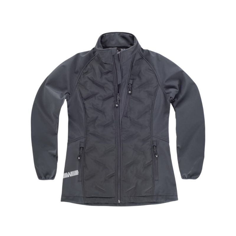 Workshell de mujer combinada con tejido acolchado sellado y con detalles reflectantes. Cuello alto con cierre de cremallera de nylon. Solapa protectora interior vuelta en la parte superior cubriendo la cremallera. Un bolso de pecho y dos laterales interiores con cierre de cremallera de nylon. Cinta reflectante decorativa personalizada en un costado. Puños ribeteados con bies elástico.