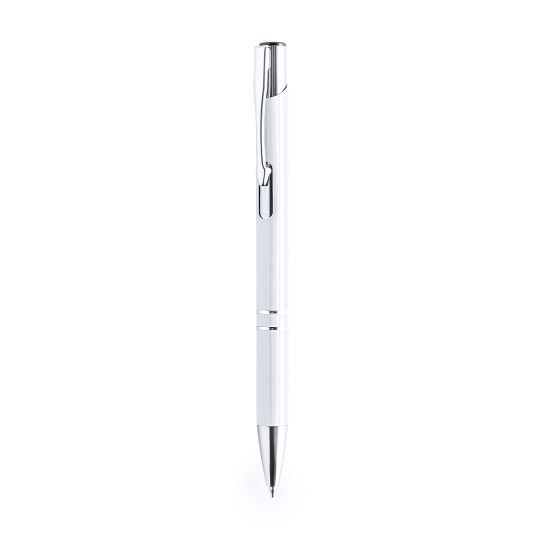 Bolígrafo de mecanismo pulsador fabricado en aluminio. Incluye accesorios plateados y clip, pulsador y punta a juego.En tinta negra.