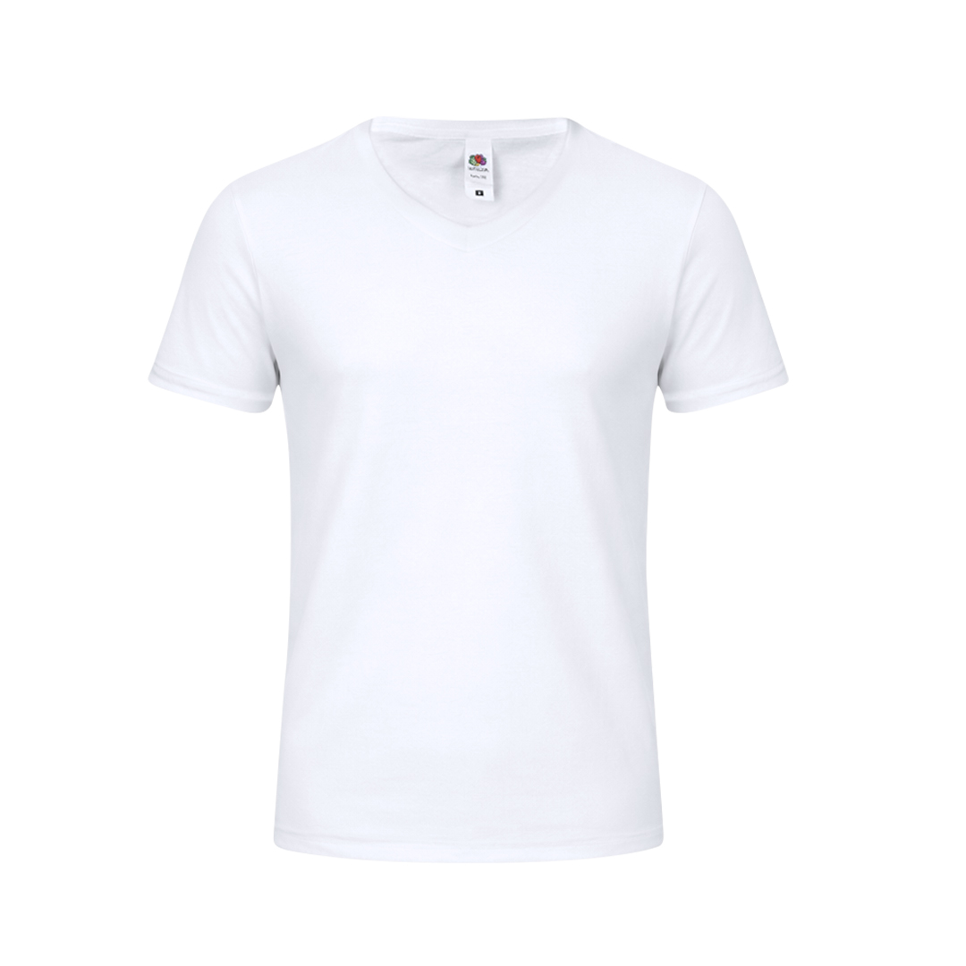Camiseta para adulto blanca Iconic V-Neck de Fruit Of The Loom. Fabricada en material 100% algodón peinado Ring Spun de 140g/m2. De tacto suave y corte moderno, con cuello en pico estrecho de canalé 1×1 y tapeta a juego. Etiqueta fácilmente removible y disponible en tallas S, M, L, XL, XXL.