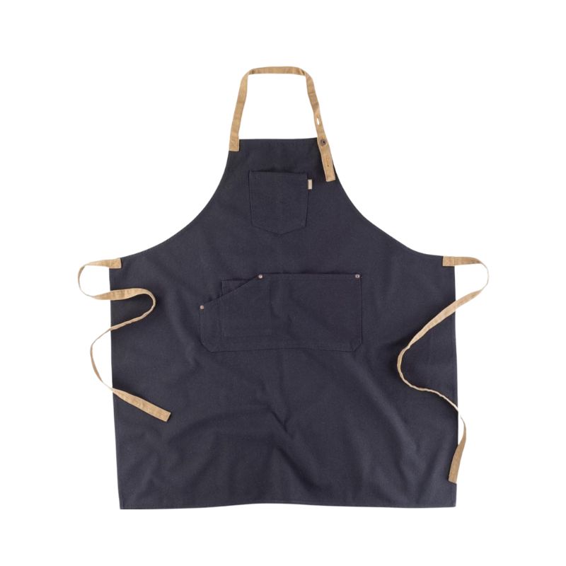 Delantal con peto en tejido canvas. Un bolso de pecho con costuras de fantasía y un bolso central de corte asimétrico compartimentado con bolsillo relojero interior. Cinta regulable con botones metálicos en el cuello y cintas para ajustar en la cintura. Diseño contemporáneo con remaches de cobre.