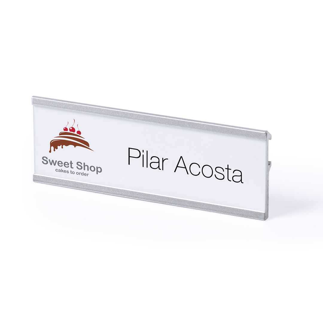 Identificador con marcos de aluminio en acabado anodizado. Parte trasera con pinza de enganche para una fijación segura.