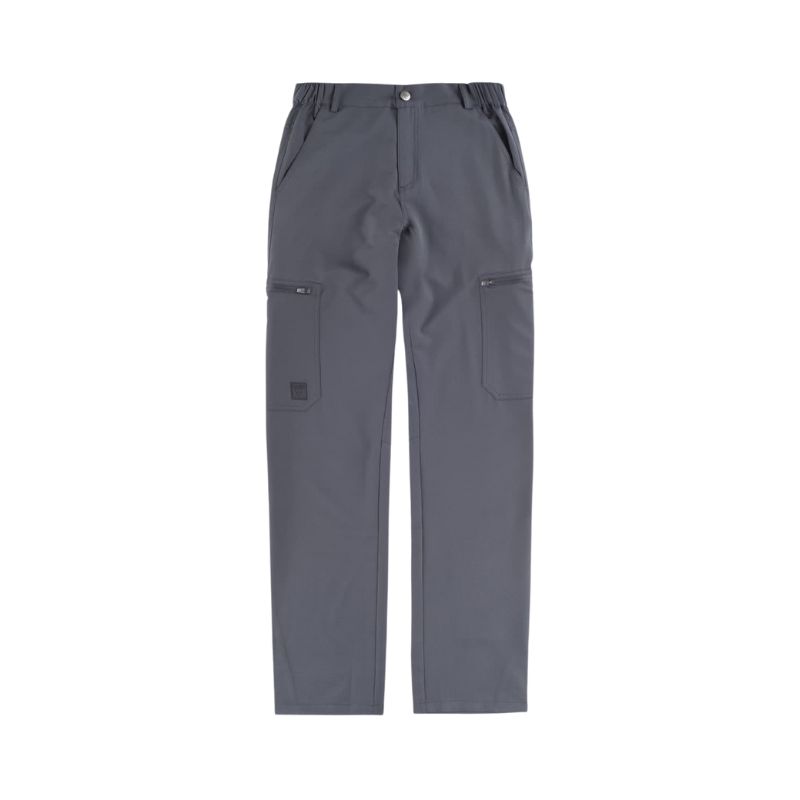 Pantalón elástico con dos bolsos de abertura inclinada en los costados. Dos bolsos de plastón con cierre de cremallera en perneras y dos bolsos traseros de plastón. Elástico en los laterales de la cintura. Trabillas. Cierre de botón metálico y bragueta de cremallera.