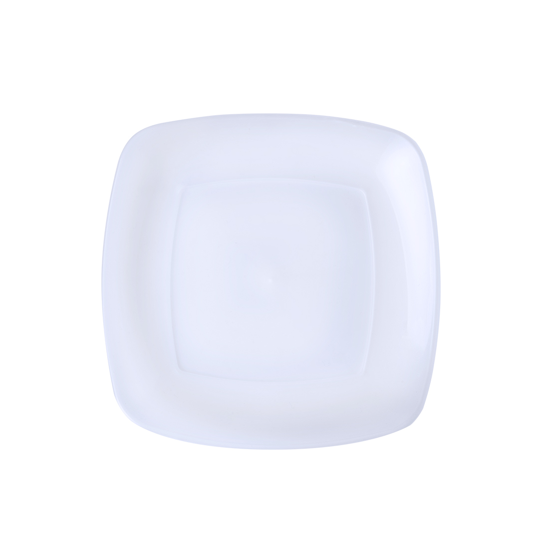 Plato plano en resistente y flexible material PP. Reutilizable y en acabado translúcido cuadrado.