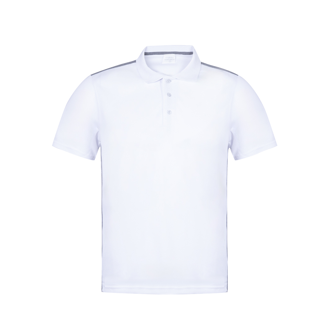 Polo técnico para adulto en poliéster transpirable de 180g/m2. De elegante diseño bicolor, en color blanco con contraste de detalles en gris. Disponible en tallas S, M, L, XL, XXL. Color blanco especialmente fabricado para marcaje en sublimación.