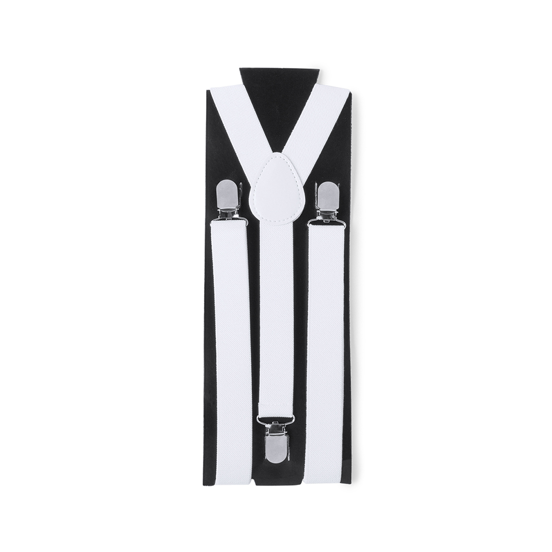 Tirántes elásticos de poliéster en sobrios colores con accesorios metálicos. Con refuerzo de polipiel en espalda a juego y presentados en original cartulina individual de color negro.