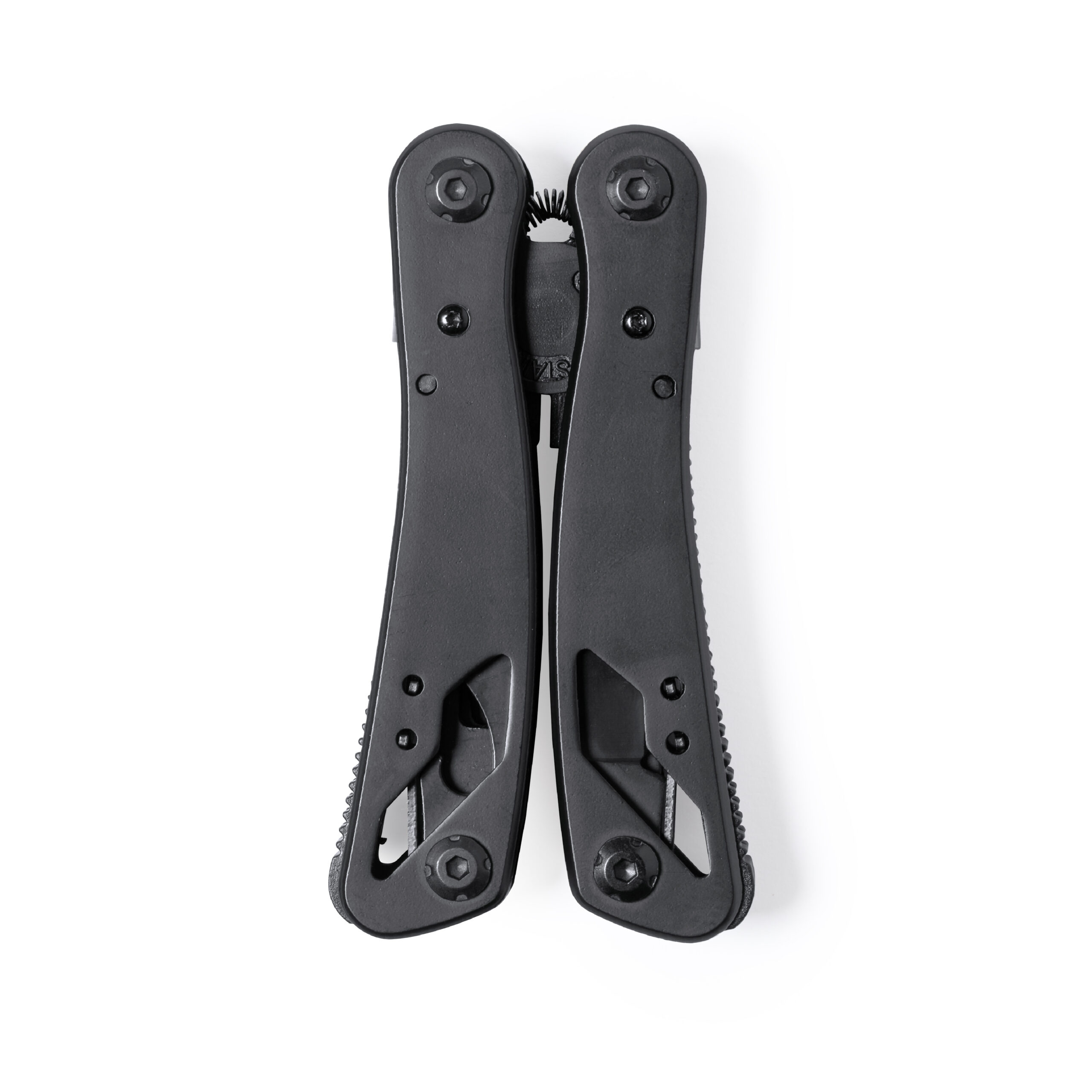 Multiherramienta con accesorios en acero inox de acabado negro y resistente empuñadura a juego en aluminio. Con 13 funciones, entre ellas cuchillo y navaja destornillador, lima abridor y alicates. Plegable y de tamaño compacto, presentada en caja individual de diseño negra.