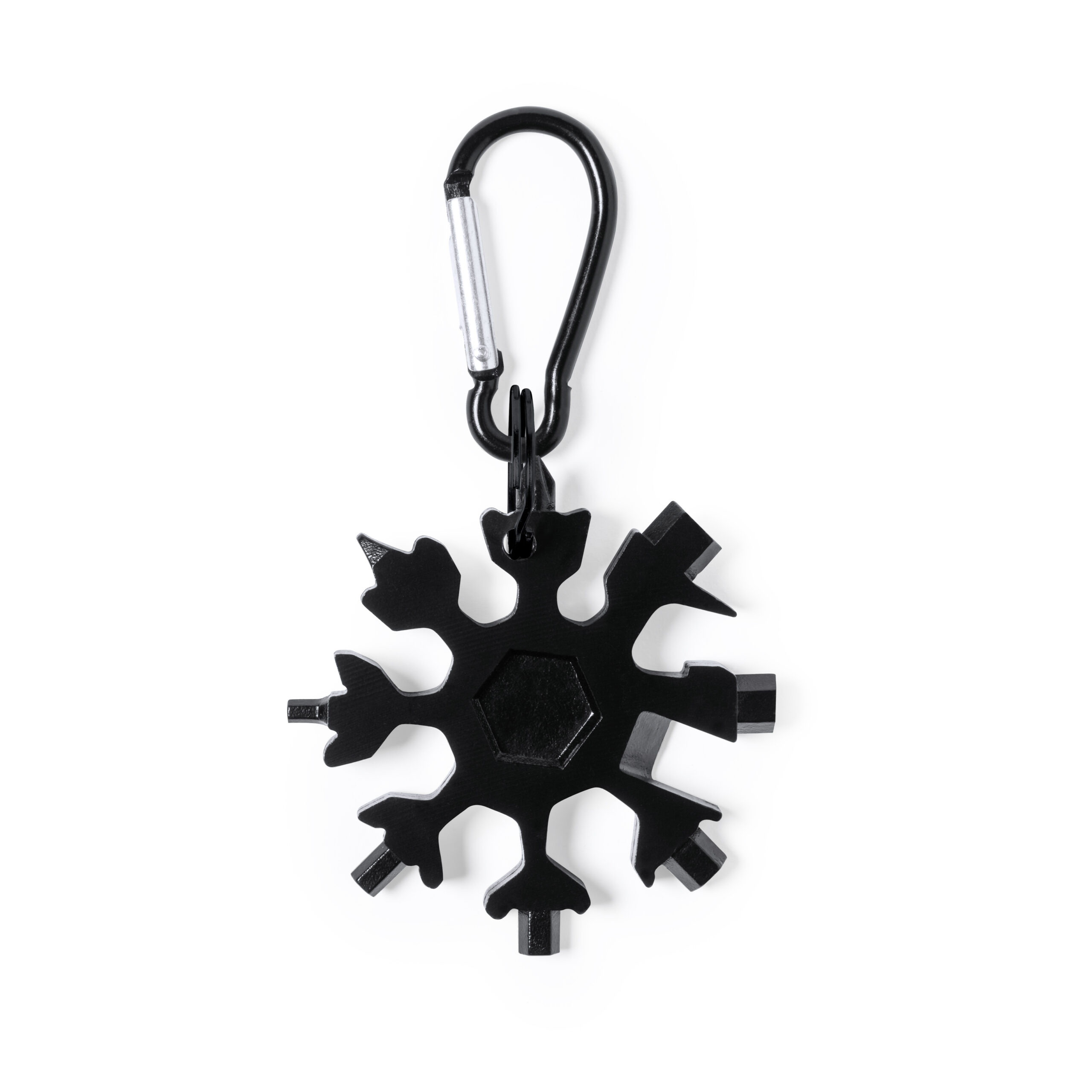 Original y práctica multiherramienta fabricada en resistente acero inox de acabado negro, con anilla y mosquetón de transporte a juego. Con 17 funciones, entre otras, destornillador puntas planas y philips llaves hexagonales tipo allen cuchillo y abrebotellas. Presentada en caja individual negra.